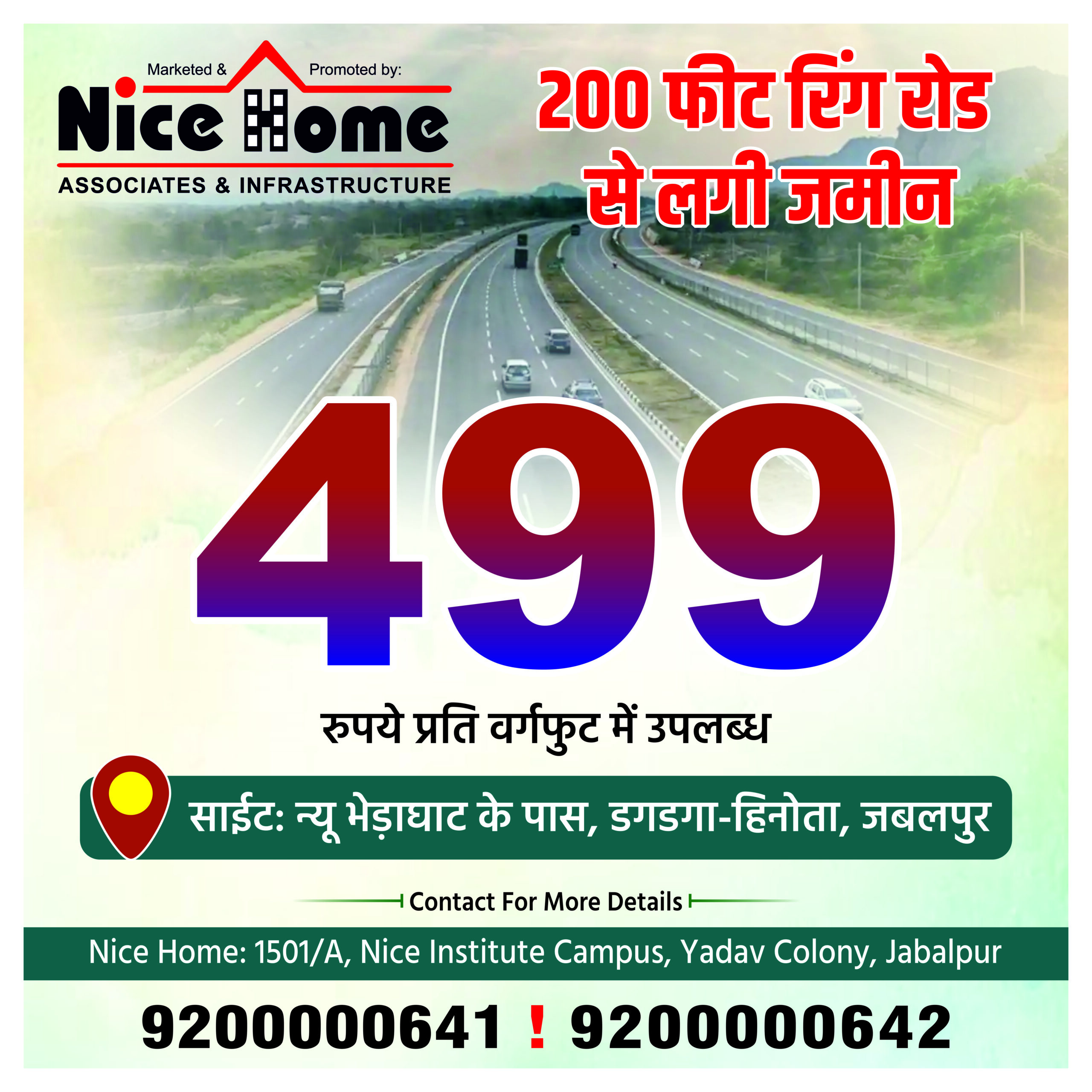 Discover your dream home with *Nice Home Jabalpur*, offering plots at just ₹499/sqft! Located near the Ring Road, this prime location ensures great connectivity, peace, and future growth. Ideal for investment or building your perfect home. Don’t miss this affordable opportunity—secure your plot today!